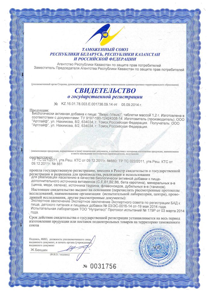 Биологически активный комплекс Арт Лайф Визус не является лекарственным средством. Перед применением проконсультироваться с врачом. Система менеджмента качества и безопасности ООО «Артлайф» сертифицирована в соответствии ISО 9001, ISО 22000 и GMP.